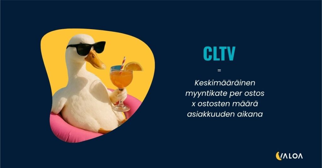 CLTV = Keskimääräinen myyntikate per ostos x ostosten määrä asiakkuuden aikana