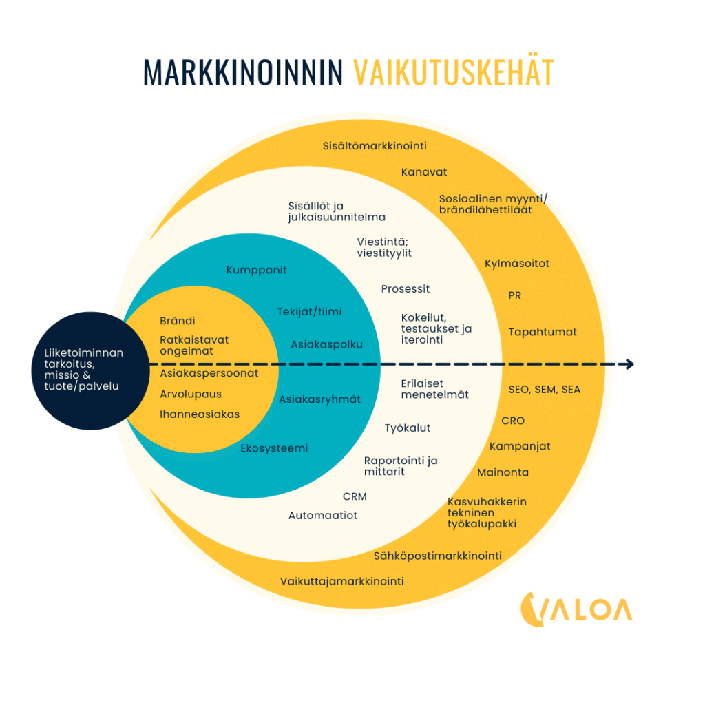 Tuloksellinen markkinointi on tiedolla johdettua tekemistä. Se on strategista liiketoiminnan, kulttuurin ja asiakkuuksien kehittämistä. Kun markkinoinnin vaikutuskehät ovat linjassa – tarkoituksesta tekemiseen ja näkyviin toimenpiteisiin – markkinointi alkaa tuottaa kannattavia tuloksia.