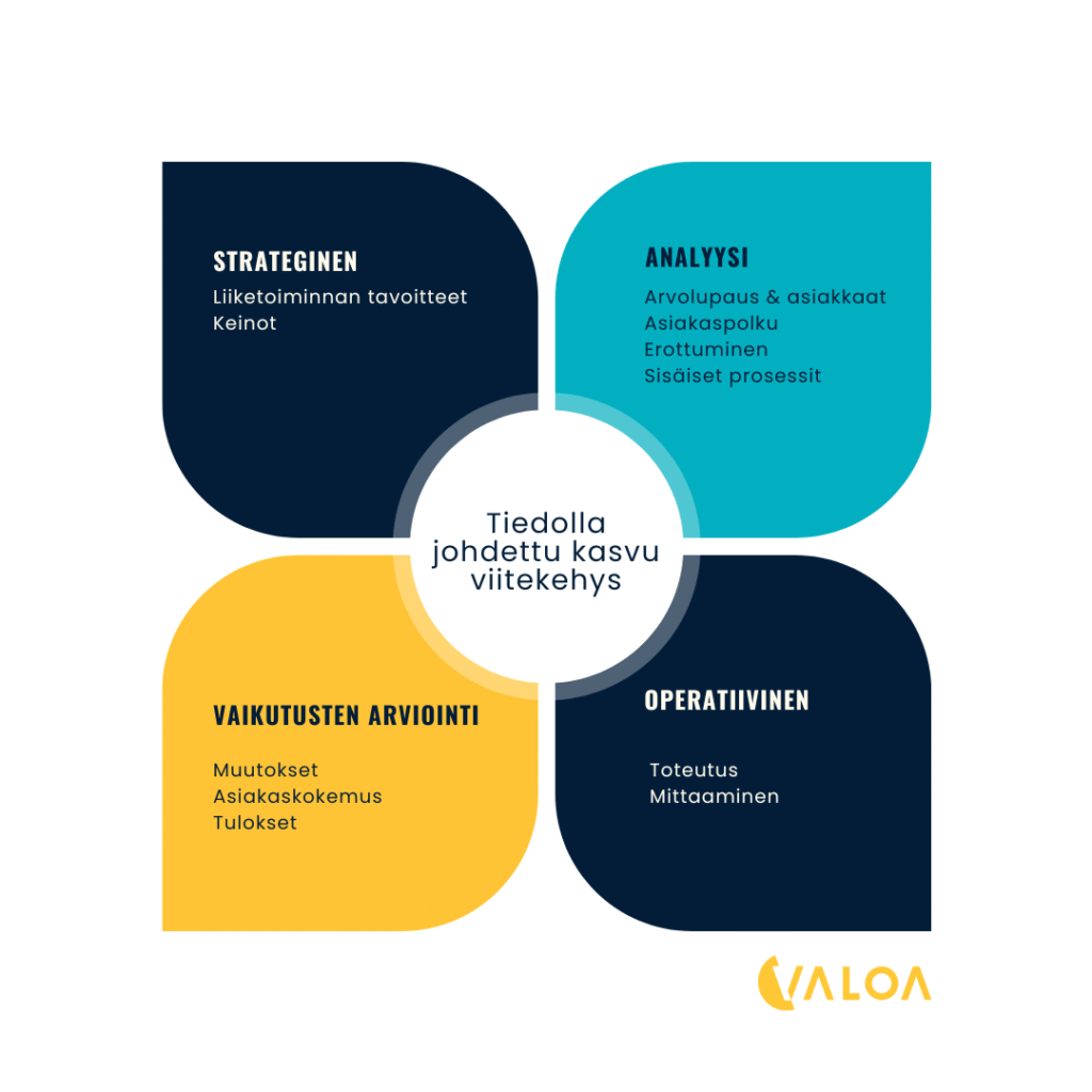 • Mittaaminen – Seurataan muutoksia asiakkaiden käyttäytymisessä ja liiketoiminnan kehityksessä.